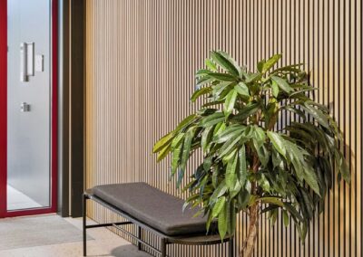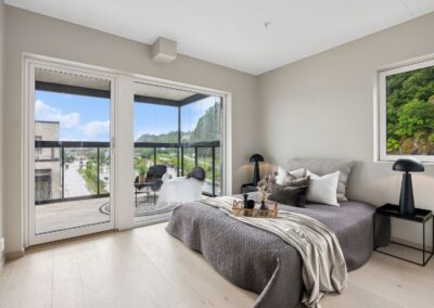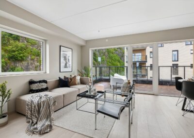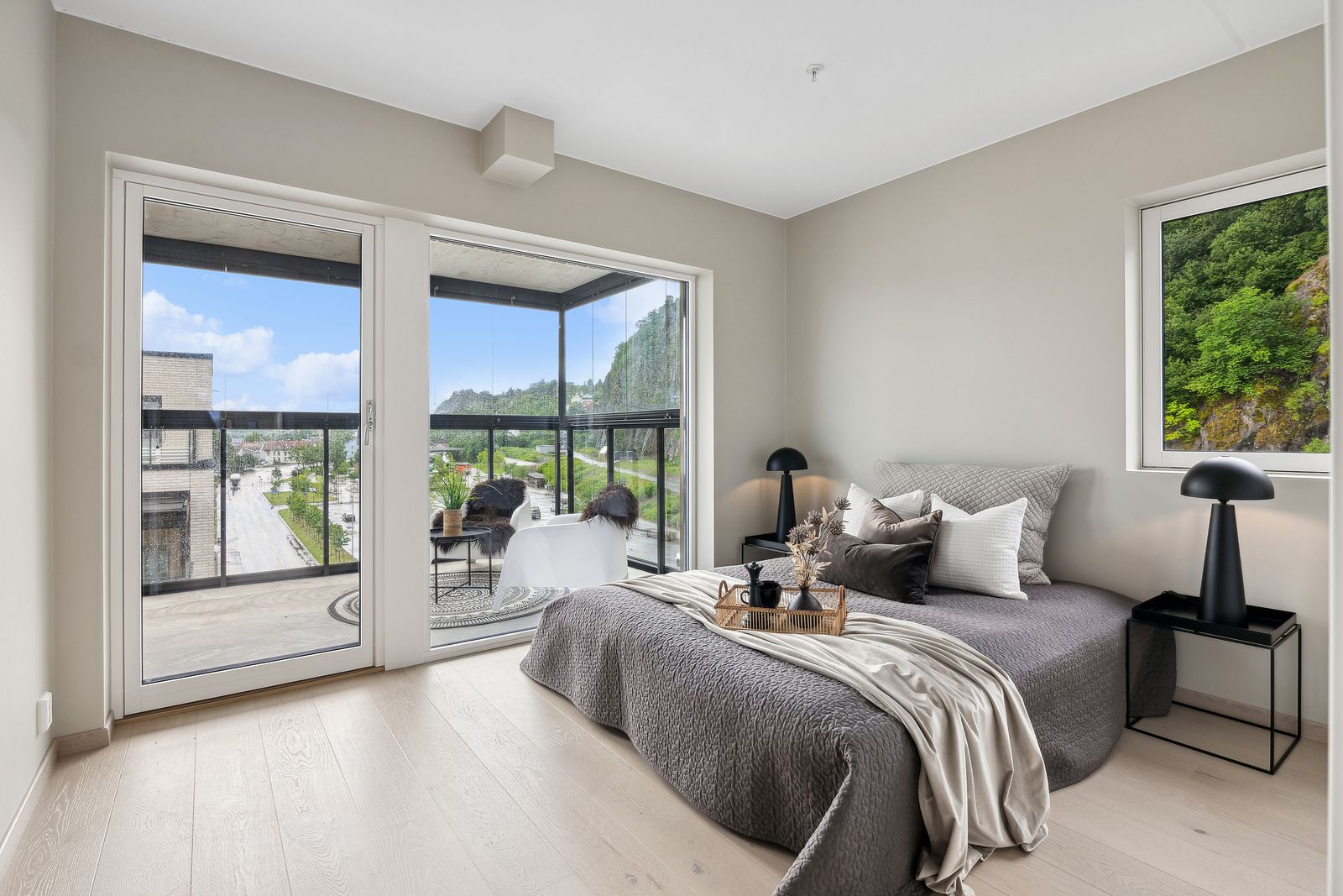 Leiligheten har en herlig terrasse på 14,2 m² som en forlengelse av stua. Fra det romslige hovedsoverommet har du også utgang til en balkong på 9 m². Balkongen er innglasset, som gjør at du kan nyte sjøutsikten herfra også på vindfulle dager.