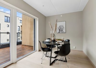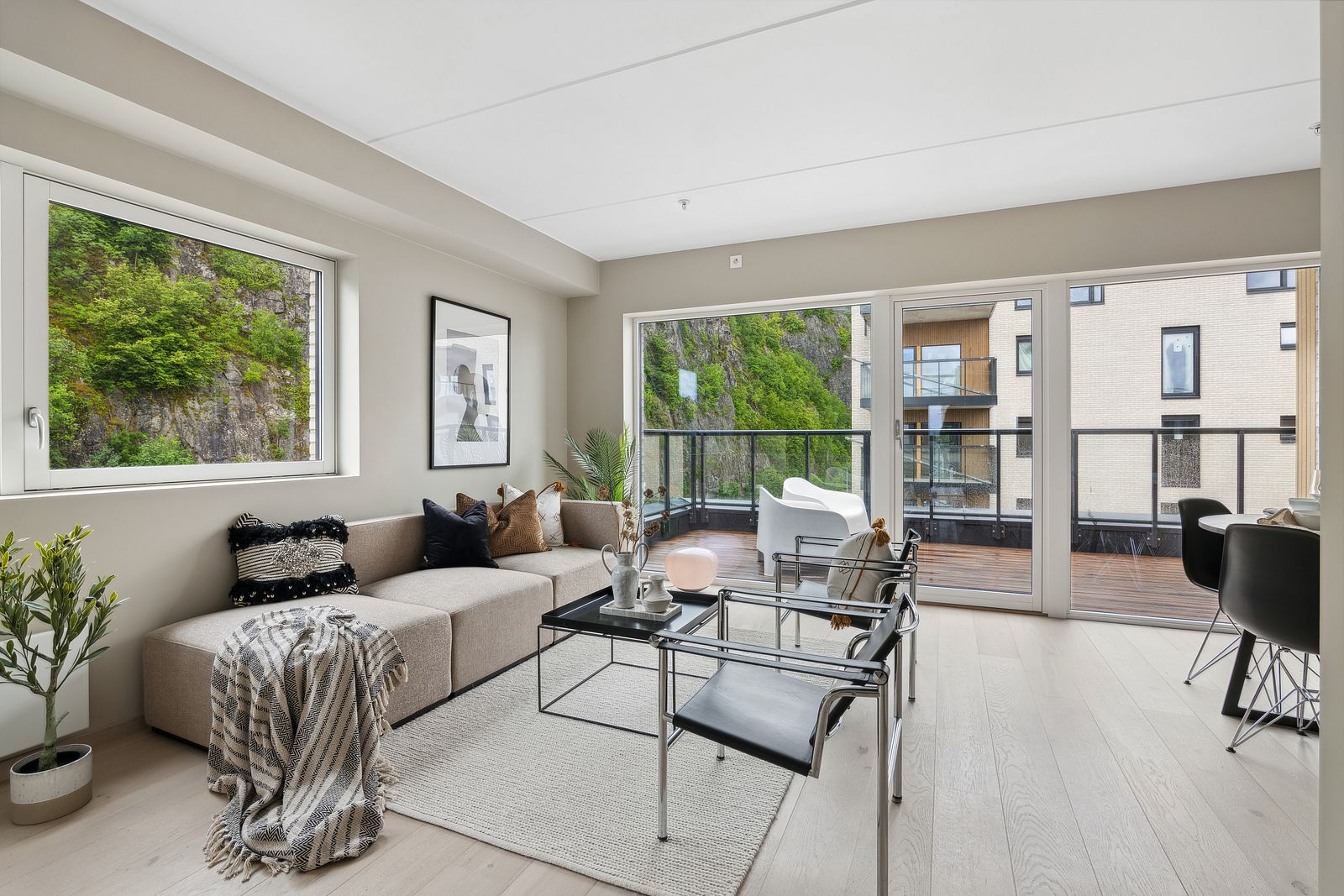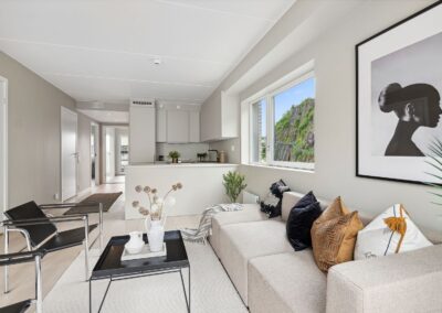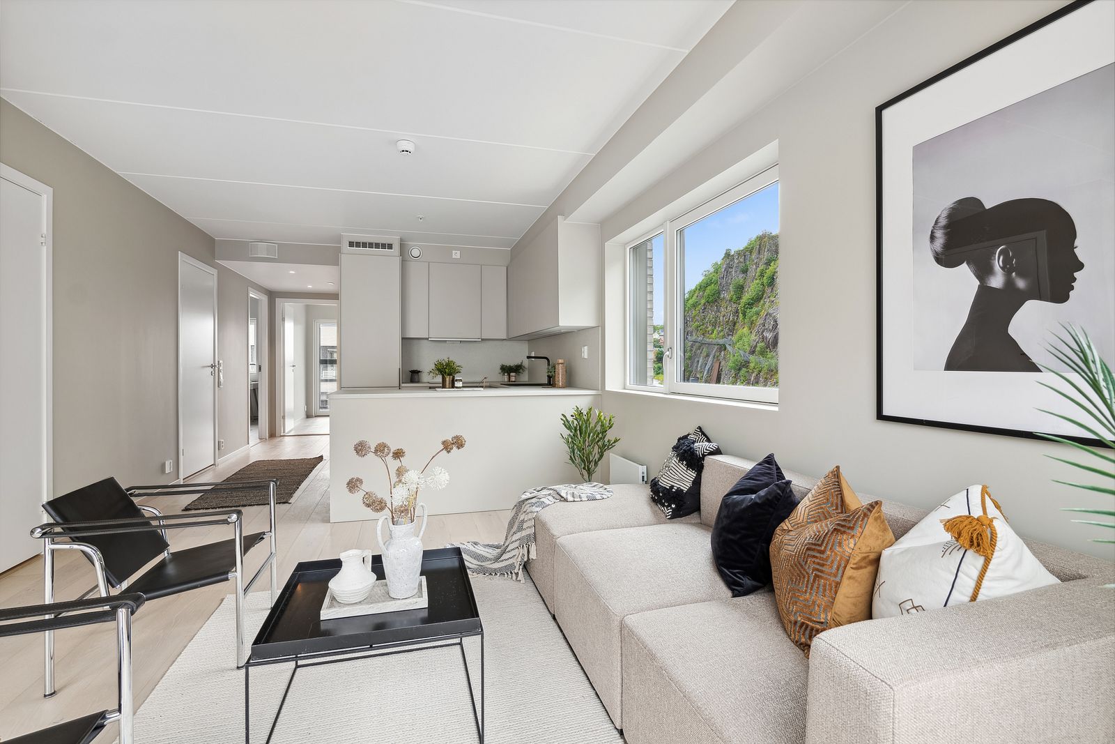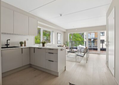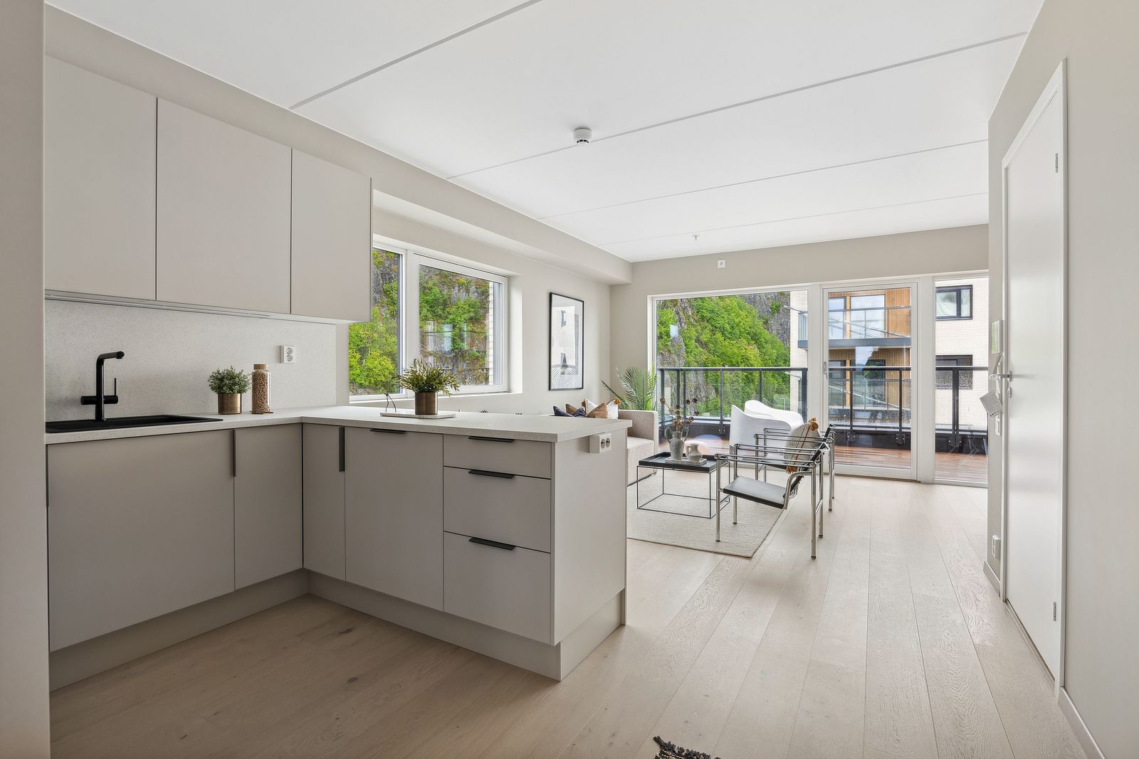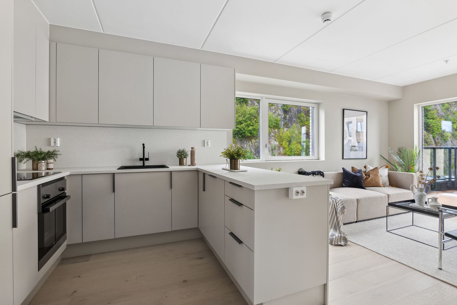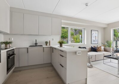 Leiligheten har en lys og åpen stue- og kjøkkenløsning. Kjøkkenet har godt med skapplass og integrerte hvitevarer fra Siemens. Plasseringen på endevegg gir leiligheten flere vinduer og et ekstra fint lysinnslipp.