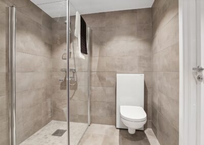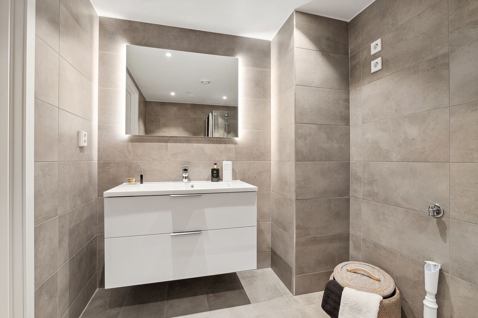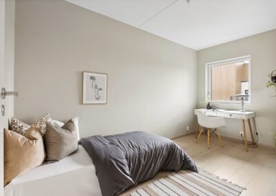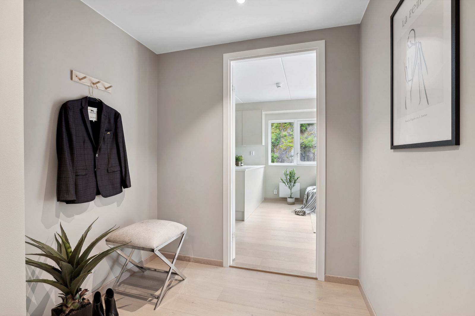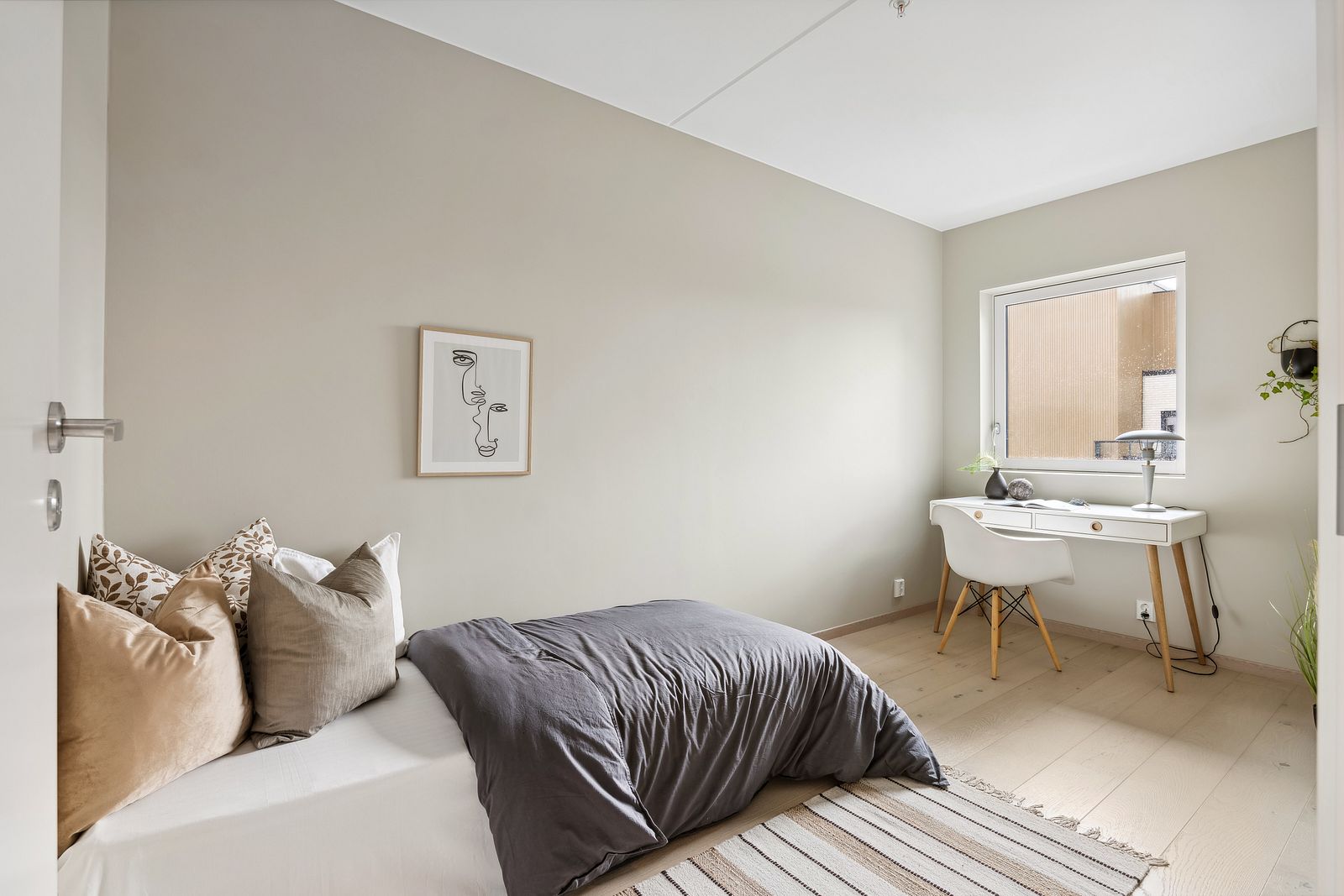 Her får du ett delikat bad og to gode soverom. Det romslige hovedsoverommet leveres med garderobeskap. Gang med plass til garderobeskap, samt egen bod på 3,1 m² gir gode oppbevaringsmuligheter i leiligheten.