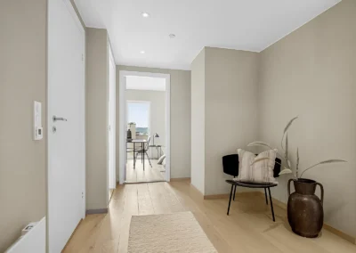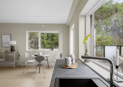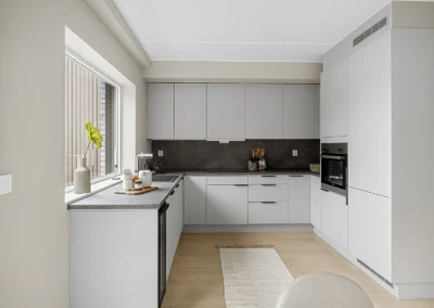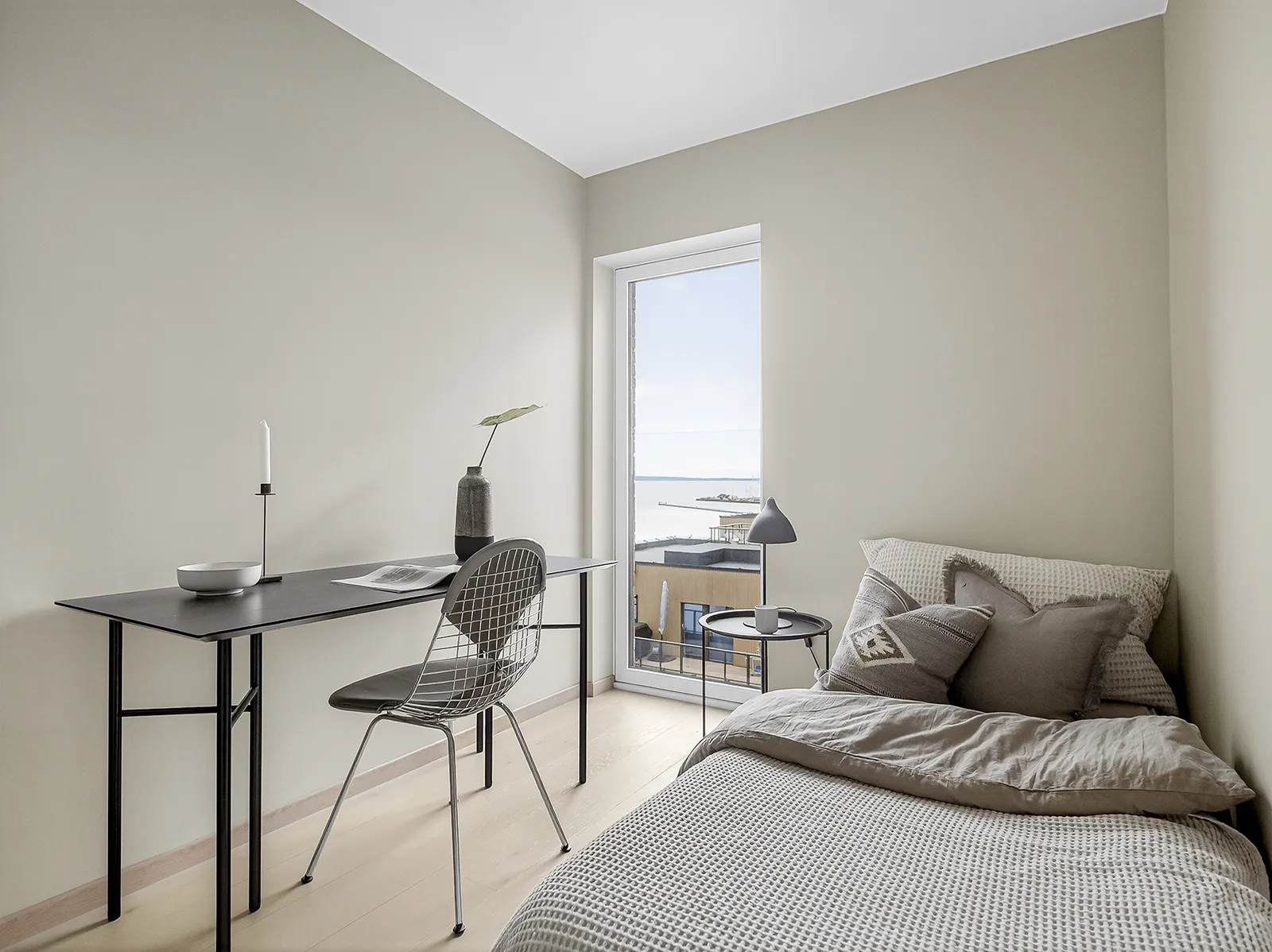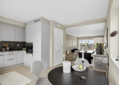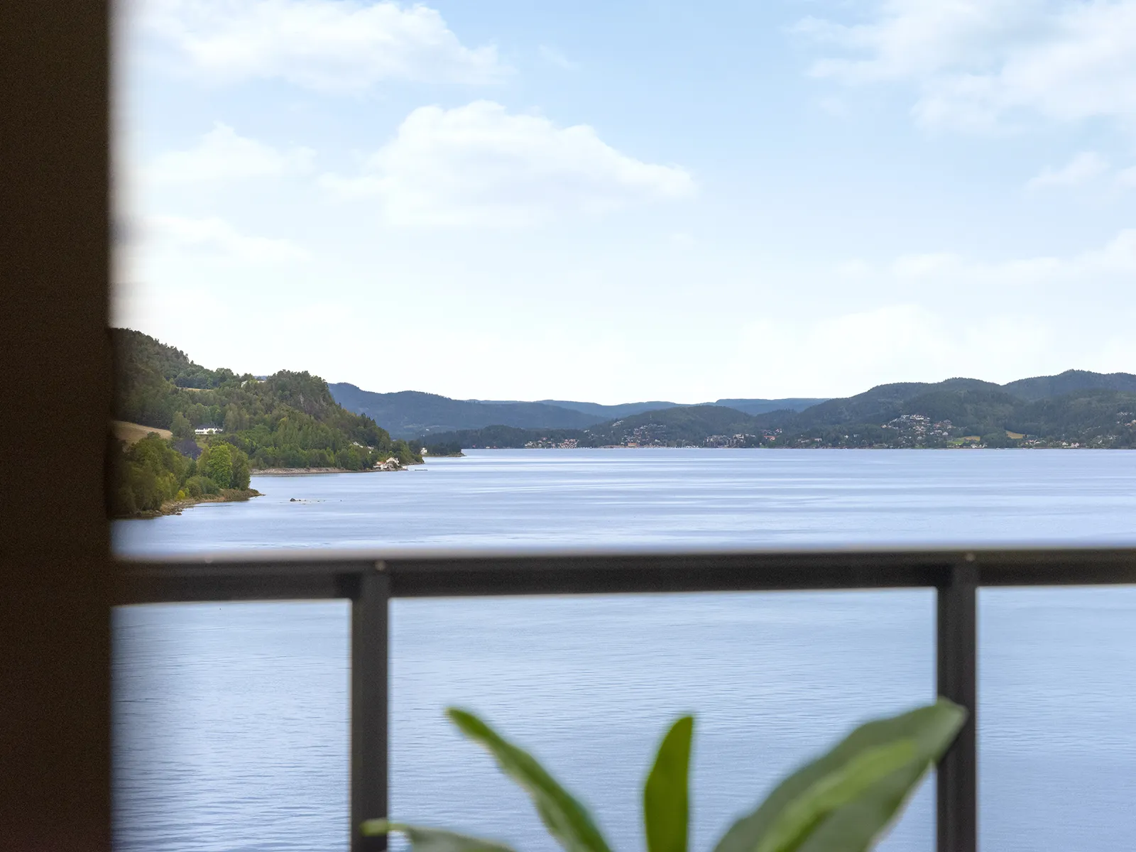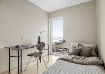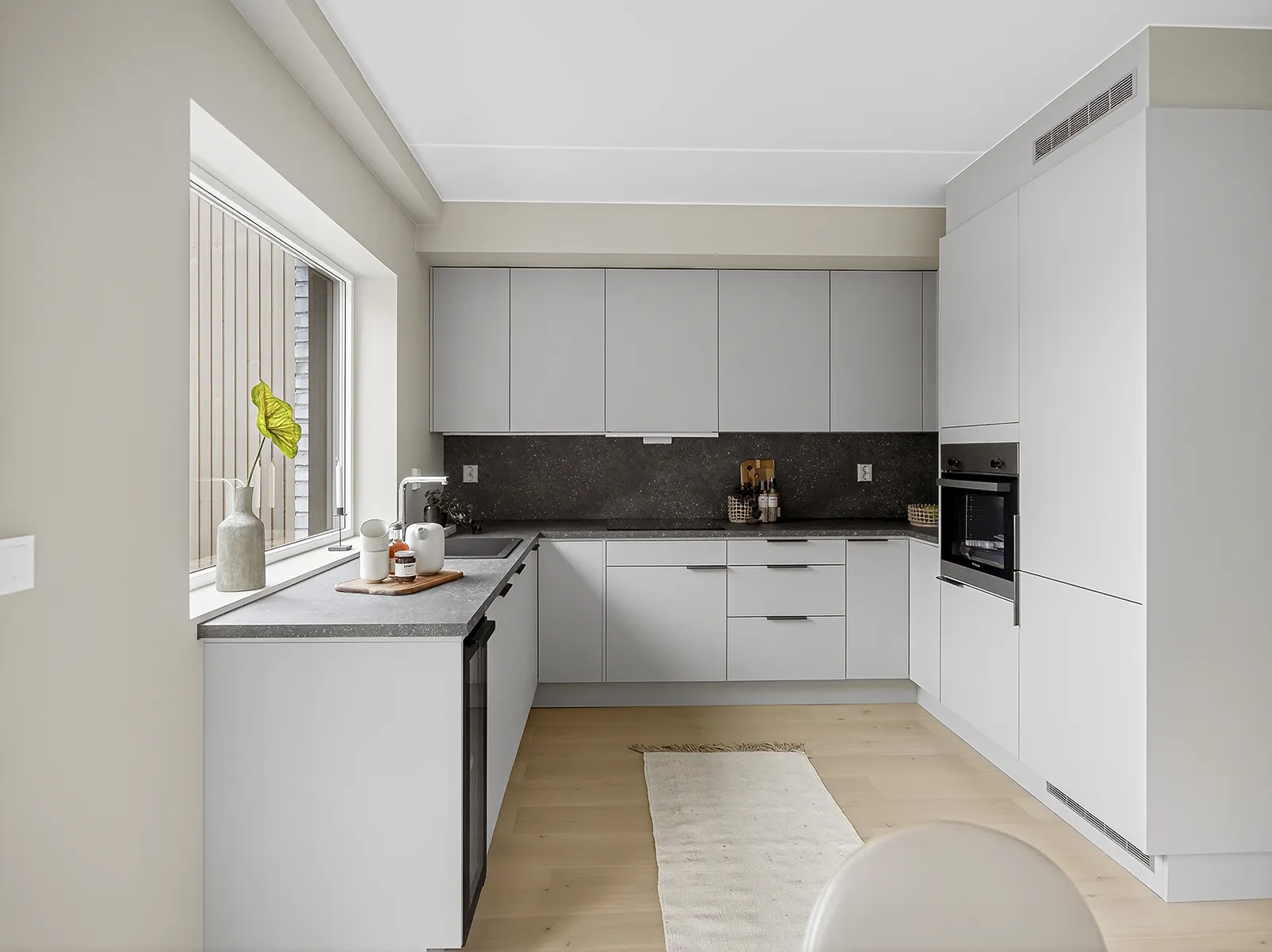 Kjøkkenet har godt med skap- og benkeplass, integrerte hvitevarer og vinskap – for å ikke å snakke om nydelig sjøutsikt. Leiligheten har to gode soverom og bad. Det romslige hovedsoverommet leveres med skyvedørsgarderobe.