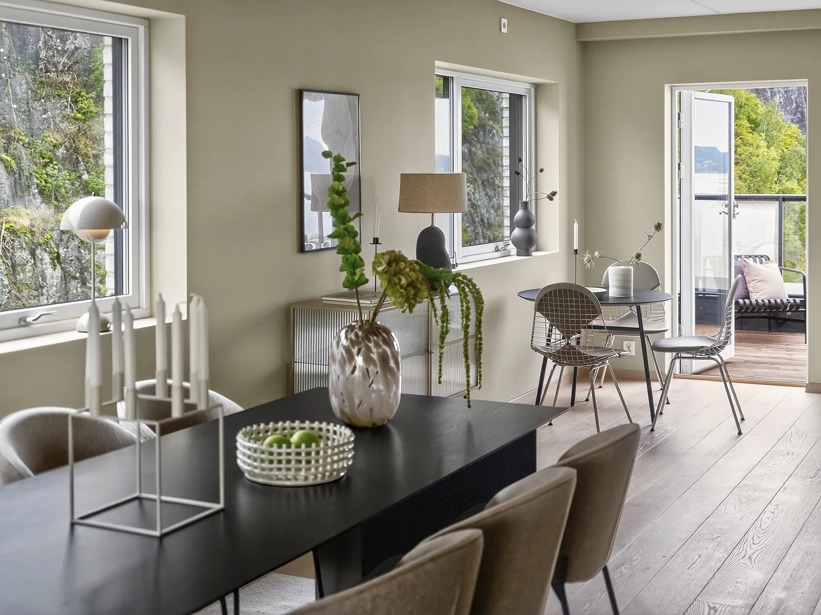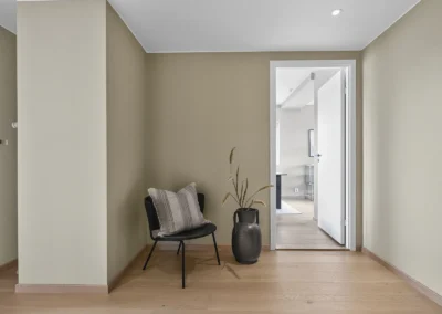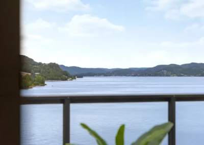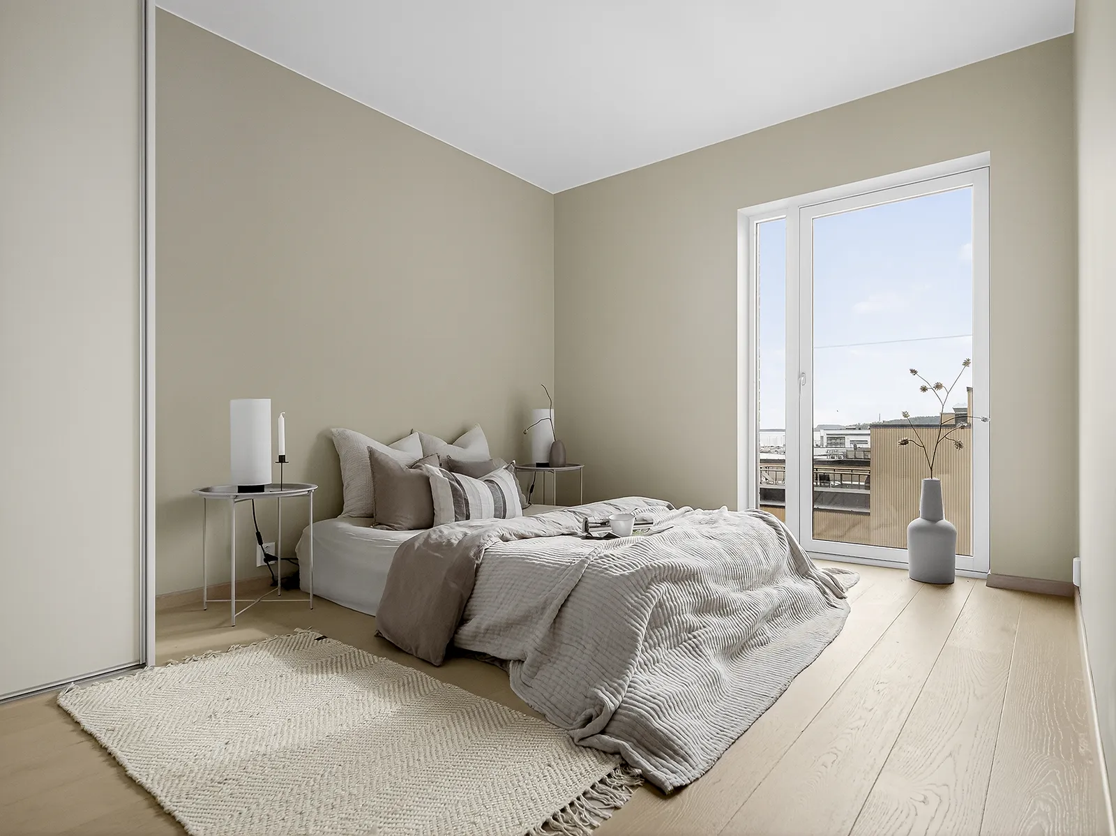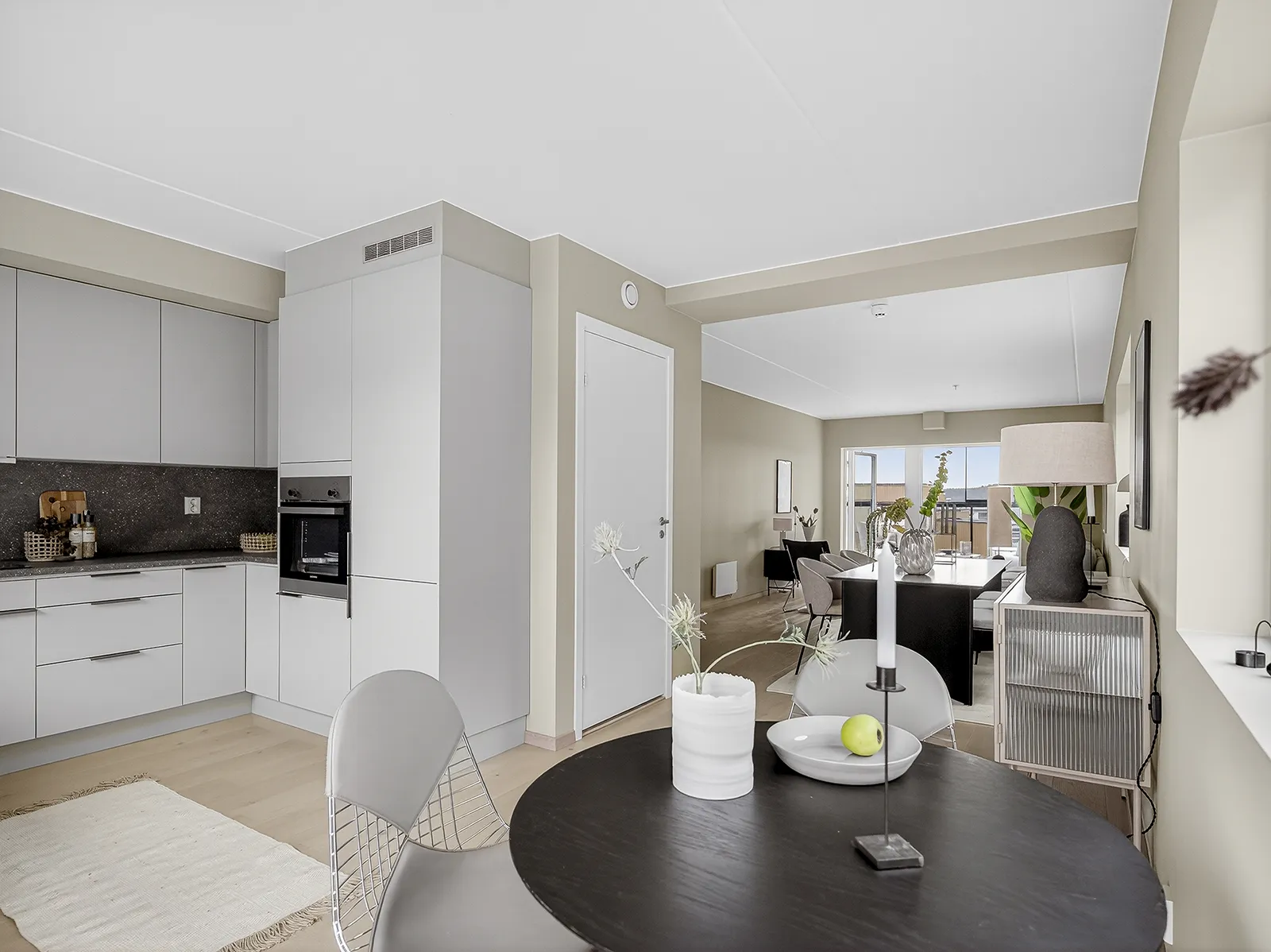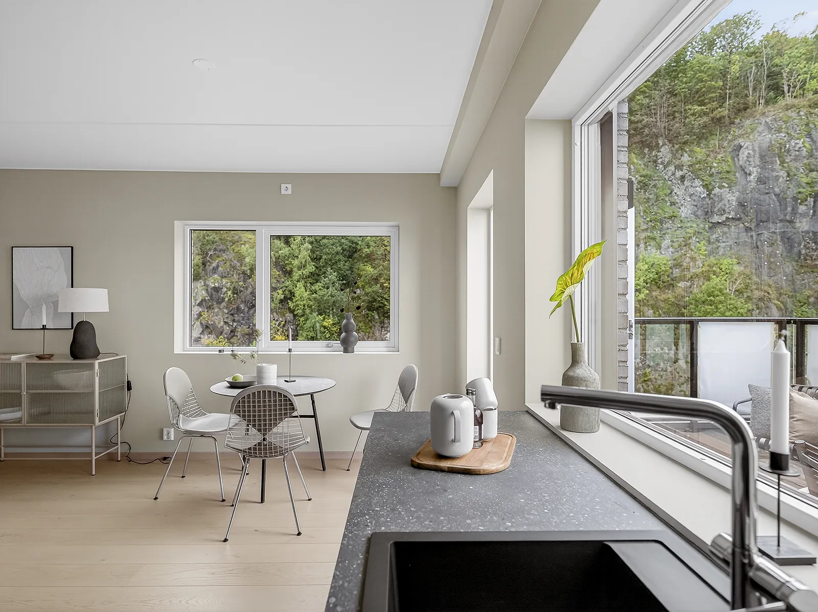 Kjøkkenet har godt med skap- og benkeplass, integrerte hvitevarer og vinskap – for å ikke å snakke om nydelig sjøutsikt. Leiligheten har to gode soverom og bad. Det romslige hovedsoverommet leveres med skyvedørsgarderobe.
